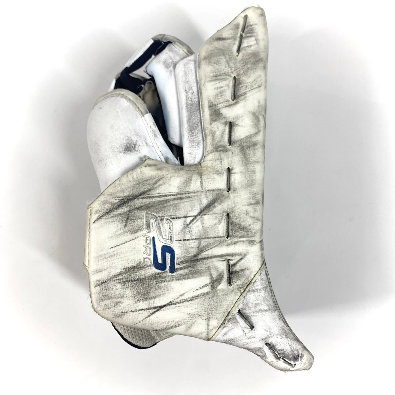 This blocker is in good used condition with no bubbling and only a small tear through one layer in the palm and some minor peeling of the letter “U” on the front Bauer logo.