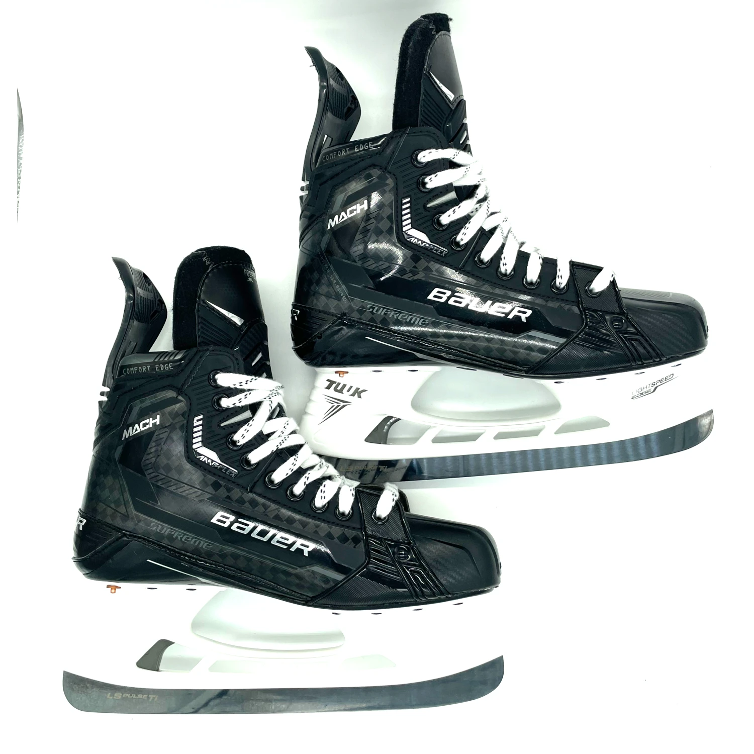 Bauer Supreme Mach skates from an AHL team. Size 9.5E with 280 Tuuk holders and LS Pulse TI steel.Â
