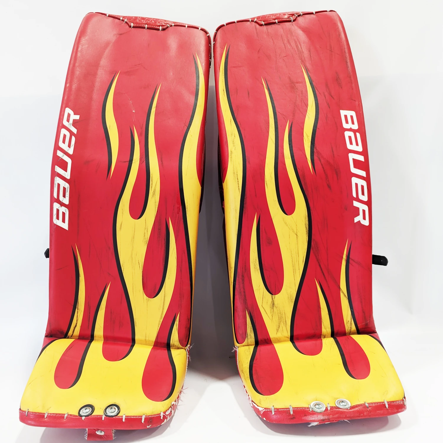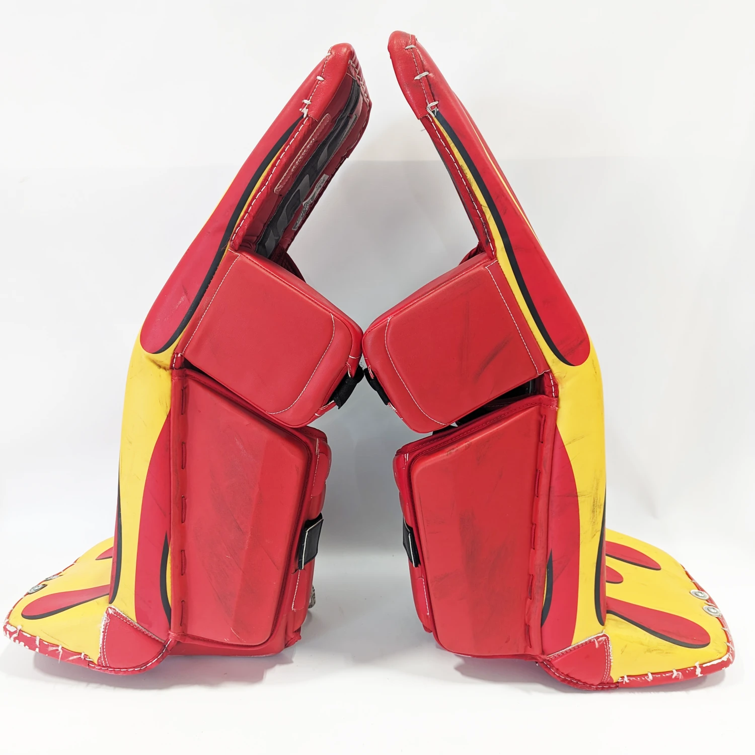 These are a pro stock set of used goalie pads from the Stockton Heat, formerly of the AHL. Other than some minor puck marks, the leather is in great shape. All straps are in working condition, but one the pads is missing a boot strap (pictured).