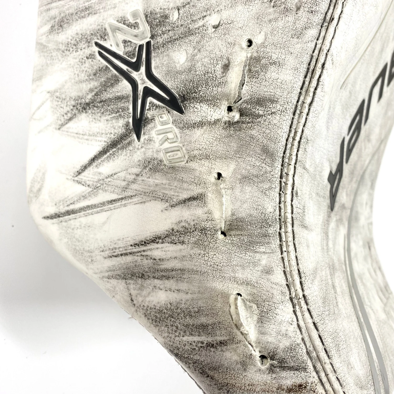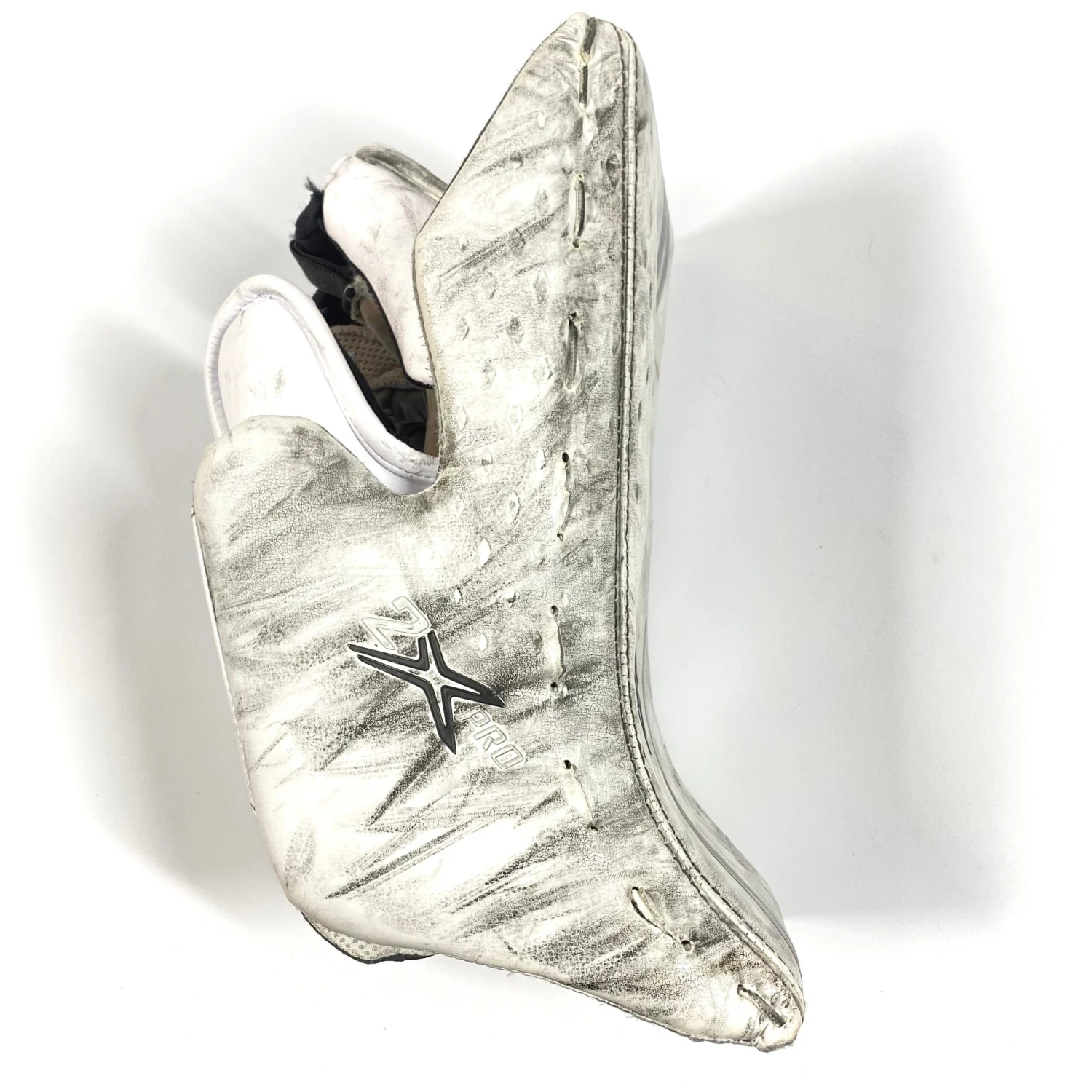 Used Bauer Vapor 2X pro goalie blocker from an NCAA team. This blocker is in used condition with a fair amount of use with lots of puck marks and general wear. The strings on the side of the blocker seem to have been ripped out or removed as there are holes where the string would weave through (pictured below). The leather wrap on the top is becoming loose and is worn in certain areas as well as a small hole in the thumb of the palm. This is priced according to condition and would be a good fit for a part time beer league goalie.Â