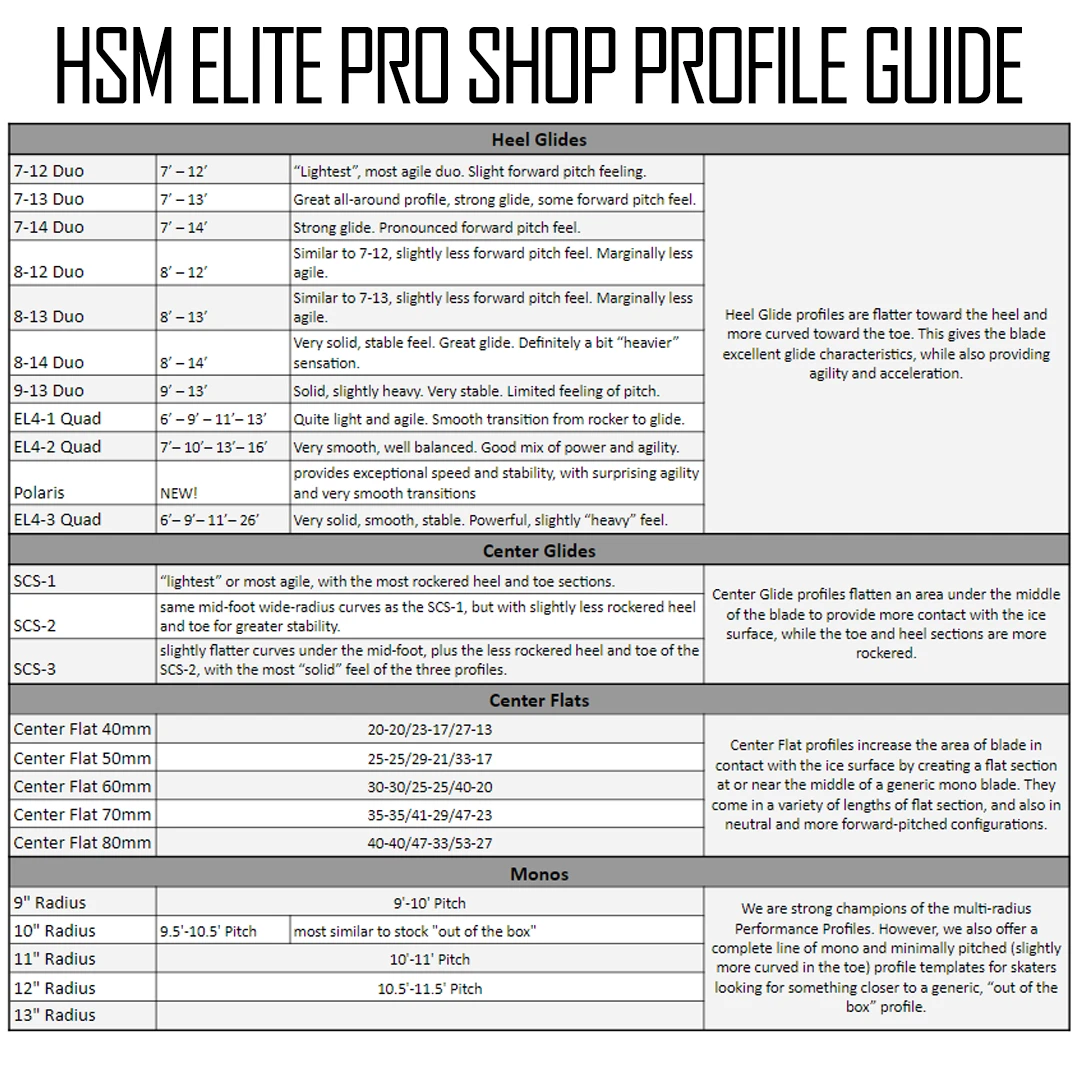 Pictured above is where you can find the size of steel that will fit in your skate holder based on the number printed on the holder. On both skates there is a 3 digit number on the outside side of the white holder on the bottom of your skate. This number will coincide with one of the options above and that is guaranteed to fit your skate.