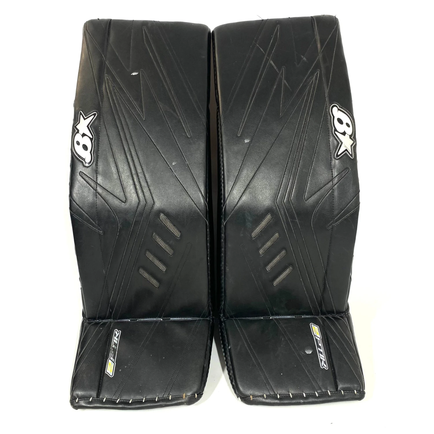 The pads are in excellent condition with only puck marks and general wear to show use. The are no rips in the leather and all the straps work as intended.Â