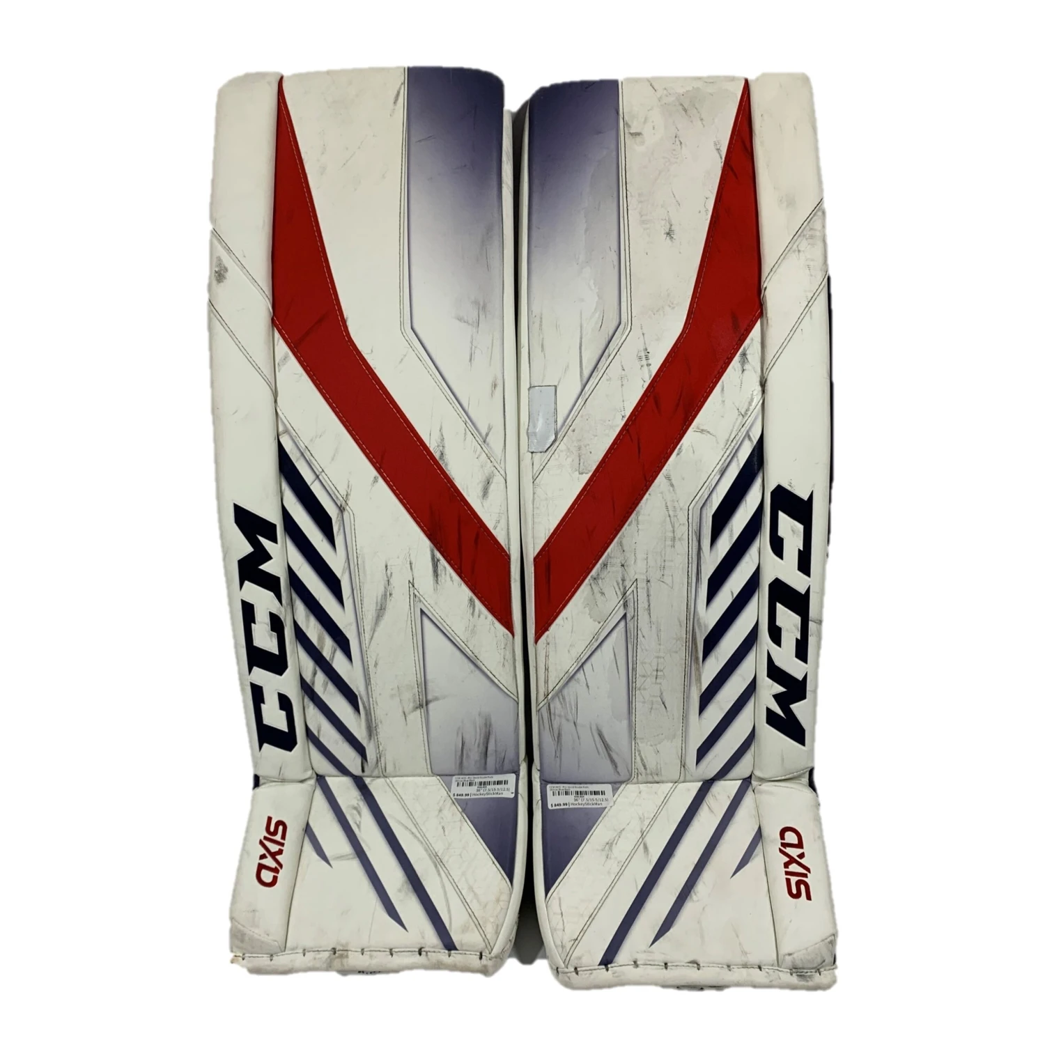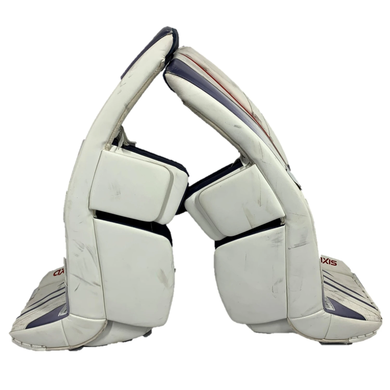 These pads have a small tear that is taped over on the front of the pad as seen in the photos. Other than that they are in great used condition with only general wear and puck marks. To keep with our standard measurements we have listed this pad at 36″ in total length but they are listed at 34+1 when compared to retail pads.
