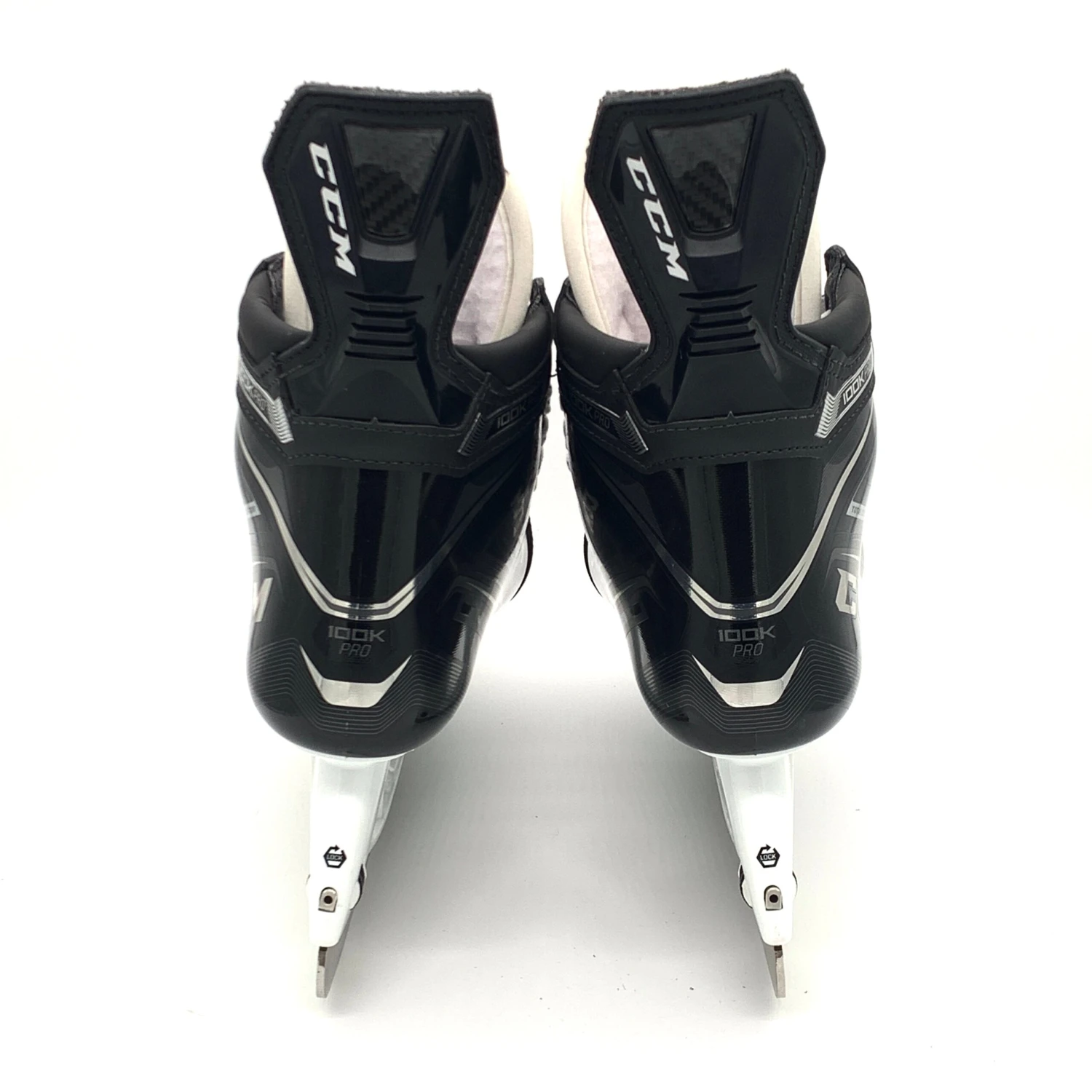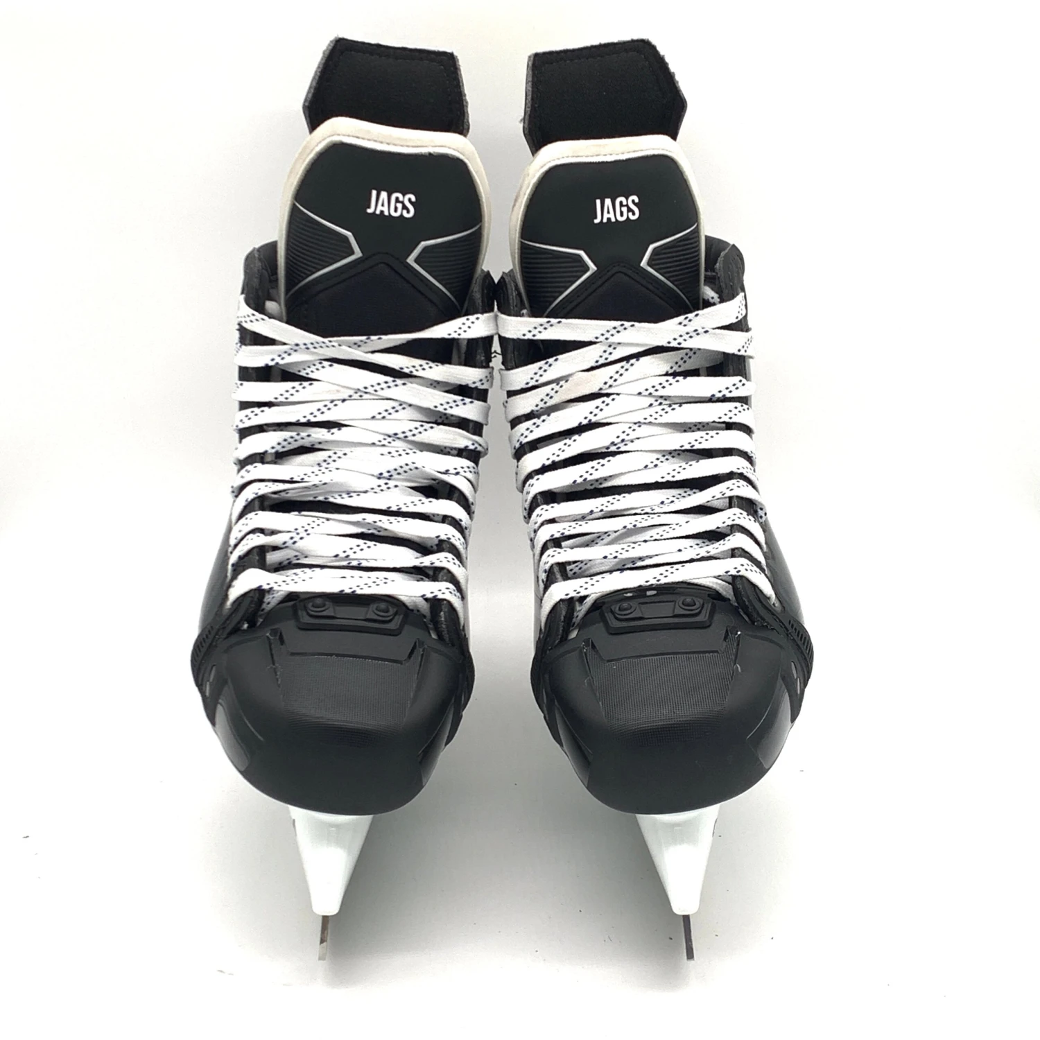 New Pro Stock CCM Ribcor 100K Pro Skates from a Pro locker room. These skates appear to be retail and are size 9.75D with 287 XS holders and XS1 Black steel. These skates have “JAGS” custom printed on the tongue.