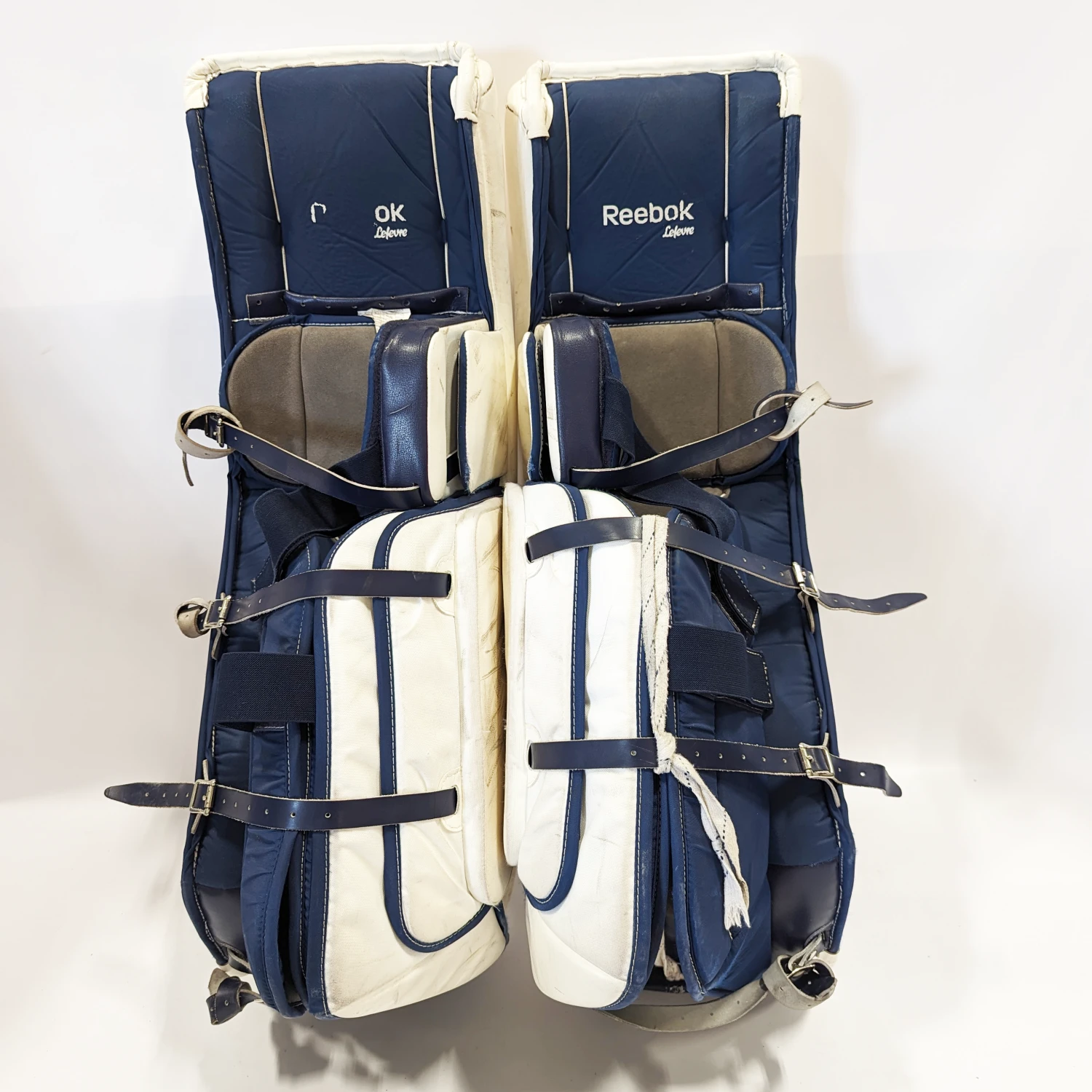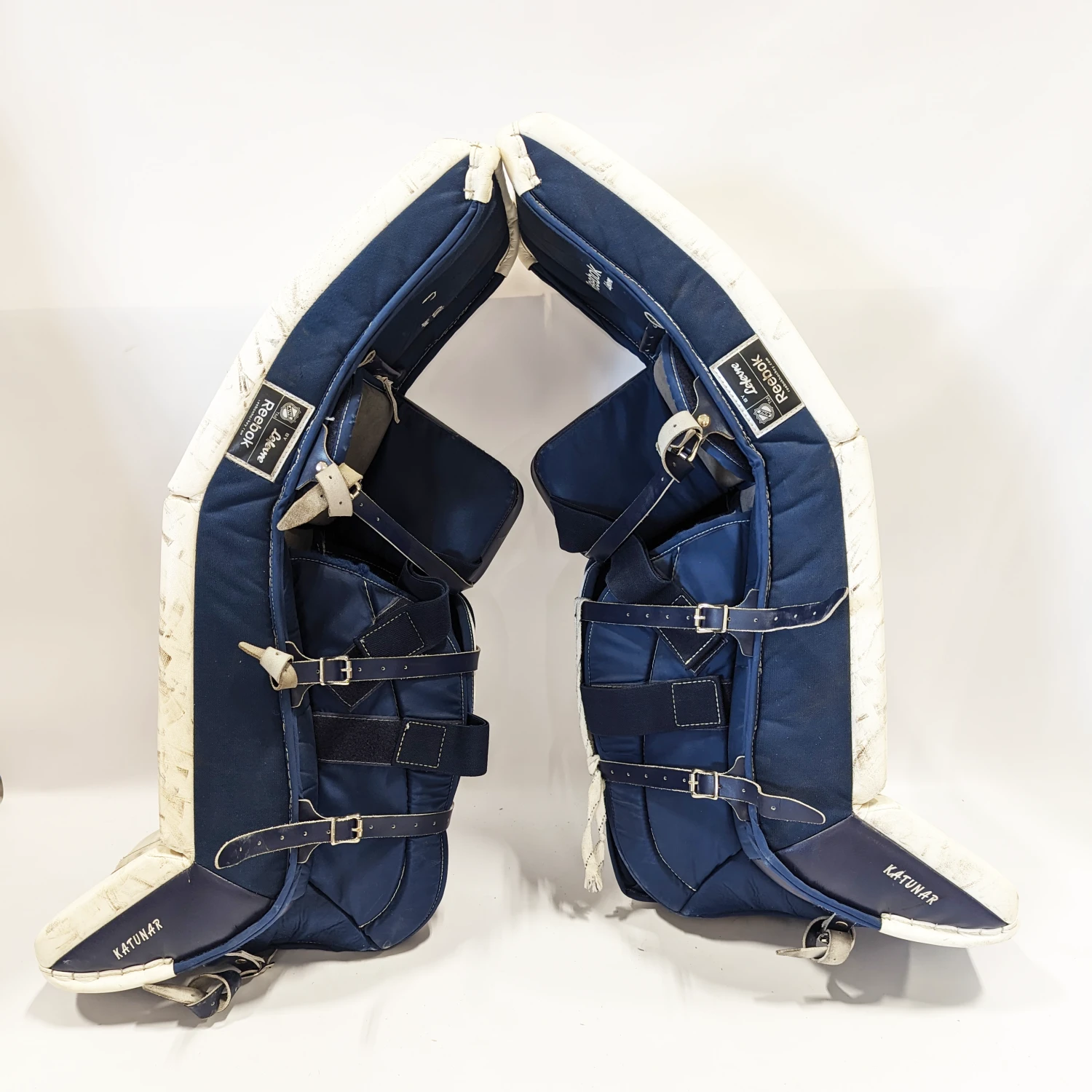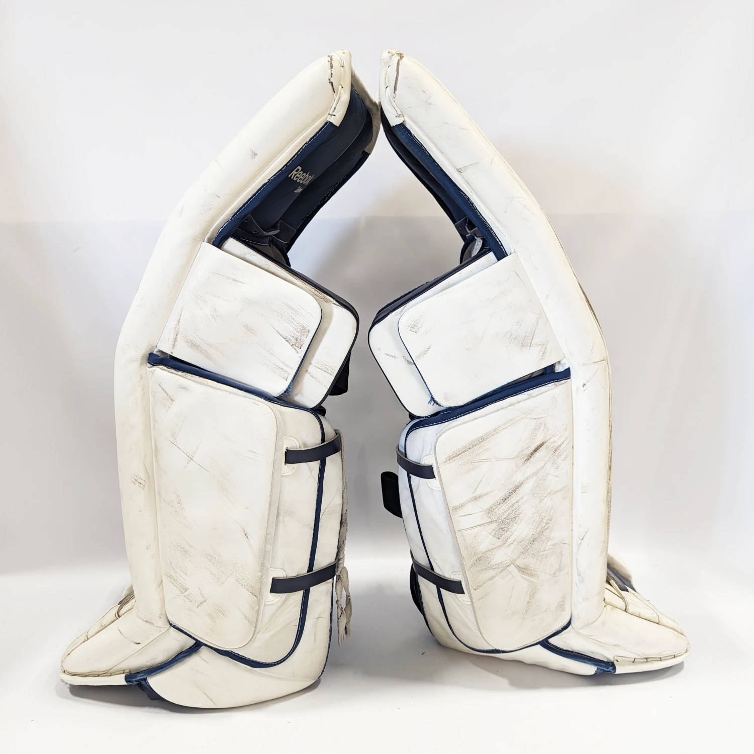 These are a pair of used Reebok XLT goalie pads in very good used condition. There are little to no signs of wear in the leather, other than a few cosmetic puck marks. All straps included are functional.