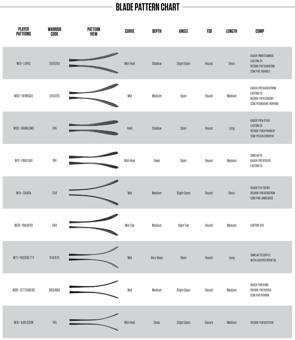 | Stick Specifications | Left – W03M (Backstrom) – 80 Flex/Max Blade (Blade 1), Left – W03 (Backstrom) – 85 Flex/63" (Blade 1), Left – W03 (Backstrom) – 95 Flex/63" (Blade 1) *Dressed as QX, Left – W03 (Backstrom) – 95 Flex/66" (Blade 1) *Dressed as QRE SL, Left – W03 (Backstrom) – 100 Flex/59" (Blade 1) *Dressed as DX, Left – W03 (Backstrom) – 100 Flex (Blade 1) *Dressed as DX, Left – W03 (Backstrom) – 100 Flex/62" (Blade 1) *Dressed as DX, Left – W03 (Backstrom) – 100 Flex/62" (Blade 1) *Dressed as LX Pro, Left – W03 (Backstrom) – 100 Flex/67" (Blade 1) *Dressed as QRE SL, Left – W03 (Backstrom) – 105 Flex (Blade 1) *Dressed as DX, Left – W03 (Backstrom) – 110 Flex/62" (Blade 1) *Dressed as QR Edge, Left – W88 (Zetterberg) – 100 Flex (Blade 2), Left – W88 Custom – 85 Flex (Blade 2 Custom) *Dressed as QX, Left – W05 (Granlund) – 75 Flex (Blade 4) *Dressed as QX, Left – W05 (Granlund) – 85 Flex/Non-Grip (Blade 4) *Dressed as LX Pro*, Left – W05 (Granlund) – 85 Flex/64" (Blade 4) *Dressed as HD1, Left – W28 (Gallagher) – 90 Flex/65" (Blade 6) *Dressed as QR Edge, Left – W02 (Lidstrom) – 90 Flex (Blade 7) *Dressed as Alpha DX*, Left – P46 (Bergeron) – 85 Flex (Blade 11) *Dressed as AK27 Alpha SL, Left – P46 (Bergeron) – 90 Flex/66" (Blade 11), Left – P90T (Pro Benn) – 75 Flex/59"/Non-Grip (Blade 12) *Dressed as HD1, Left – Pro O'Reilly – 90 Flex/61" (Custom) *Dressed as Alpha LX Pro*, Left – Toe Curve (Pro Stastny) – 105 Flex/Max Blade (Custom) *Dressed as QR Edge, Right – W03 (Backstrom) – 75 Flex (Blade 1) *Dressed as DX SL*, Right – W03M (Backstrom) – 95 Flex/66"/Max Blade (Blade 1), Right – W05 (Granlund) – 87 Flex/61" (Blade 4) *Dressed as QRE, Right – W05 (Granlund) – 87 Flex/61" (Blade 4) *Dressed as DX SL, Right – W28 (Gallagher) – 80 Flex/59" (Blade 6), Right – Toe (Pro Malgin) – 75 Flex/56" (Custom), Right – Custom Toe Kink – 80 Flex/60" (Custom) *Dressed as QRE10* |